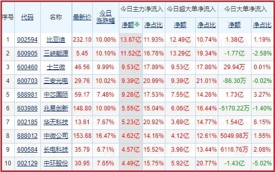 今日沪深两市主力资金净流入排名前5的个股分别为:比亚迪、三峡能源、士兰微、三安光电、中芯国际;主力资金净流出排名前5的个股分别为:中国平安、TCL科技、牧原股份、中国中免、飞利信。