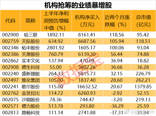 业绩预增往往会带来一波中报行情,部分业绩暴增股已有机构提前布局。统计显示,在已披露中报业绩预告的个股中,龙虎榜披露近两个月获机构净买入的个股共有13只,合计净买入6.12亿元。机构抢筹的业绩暴增股整体近期表现较好,近两个月平均累计上涨35.1%,其中哈三联、天际股份、柘中股份近两个月均实现股价翻倍,天原股份累计上涨56.44%。