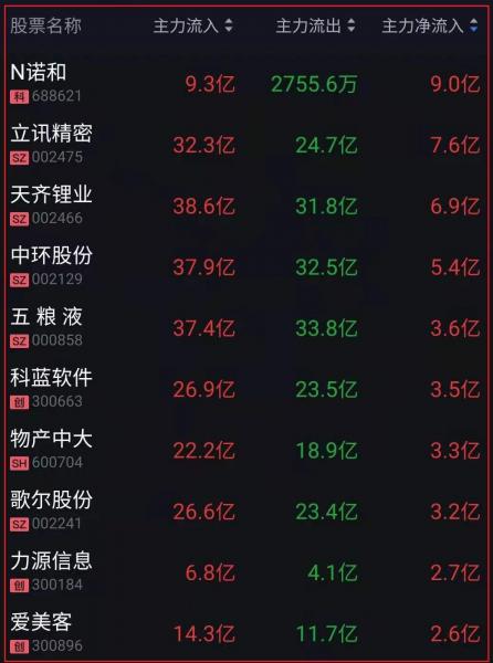 资金净流入十大人气热股: