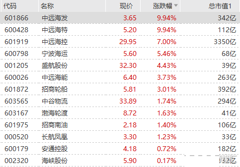 海运板块大幅走高,中远海发、中远海特双双涨停,龙头中远海控大涨7%续创多年新高,宁波海运、盛航股份、中远海能等集体跟涨。