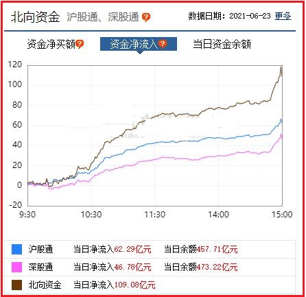截至收盘: 北向资金净流入109.08亿元,其中沪股通资金净流入62.29亿元,深股通资金净流入46.78亿元。