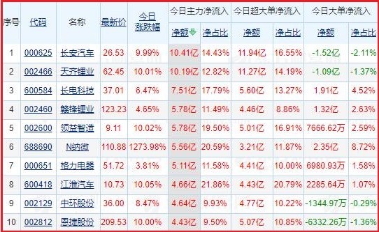 今日沪深两市主力资金净流入排名前5的个股分别为:长安汽车、天齐锂业、长电科技、赣锋锂业、领益智造;主力资金净流出排名前5的个股分别为:五 粮 液、DR隆基股、中远海控、山西汾酒、泸州老窖。