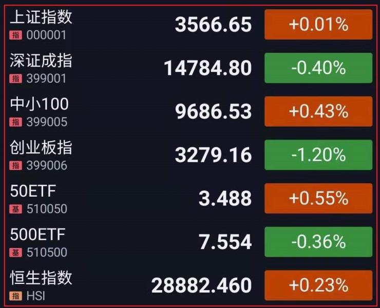 1.A股三大指数集体高开。随后股指悉数翻绿,创指再度失守3300点,光伏概念、HIT电池掀涨停潮,军工股短线拉升;白酒、盐湖提锂、钛大幅回调,大化工板块全线走弱。盘中指数走势分化,电力、煤炭股回暖,证券、期货、保险等金融股护盘;饮料、餐饮等消费板块遇冷,光刻胶、半导体等芯片概念股回调。午后指数震荡盘整,可降解塑料、稀土短线拉升,医美、数字货币表现低迷。总体来看,资金面有所收紧,市场情绪偏向谨慎,两市逾2700个股下跌。截至收盘,上证指数涨0.01%,报3566.65点,深证成指跌0.40%,报14784.80点,创业板指跌1.20%,报3279.16点;