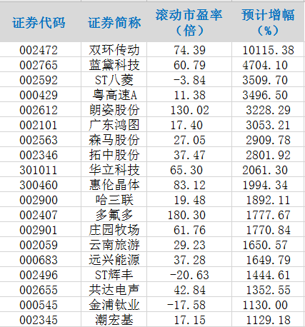 在业绩预增的上市公司中,以预计净利润增幅中值统计,共有19只个股净利润同比增幅超过10倍,双环动力预计净利润增幅排名第一。