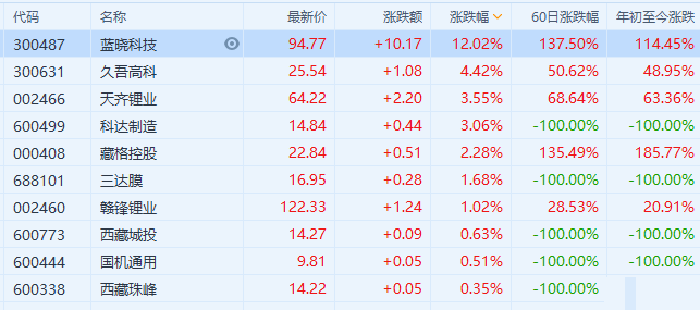 盐湖提锂板块走强,蓝晓科技大涨超12%,天齐锂业、藏格控股、科达制造、久吾高科等跟涨。中信证券研报认为,2021年料将成为国内盐湖提锂产业发展的拐点之年,盐湖提锂路线低成本,低碳绿色和一体化的优势使其具备更强的成长性和更高的确定性。建议关注:1)产能释放顺利且具有产能扩张预期的盐湖提锂企业;2)受益于吸附法提锂技术推广的公司。