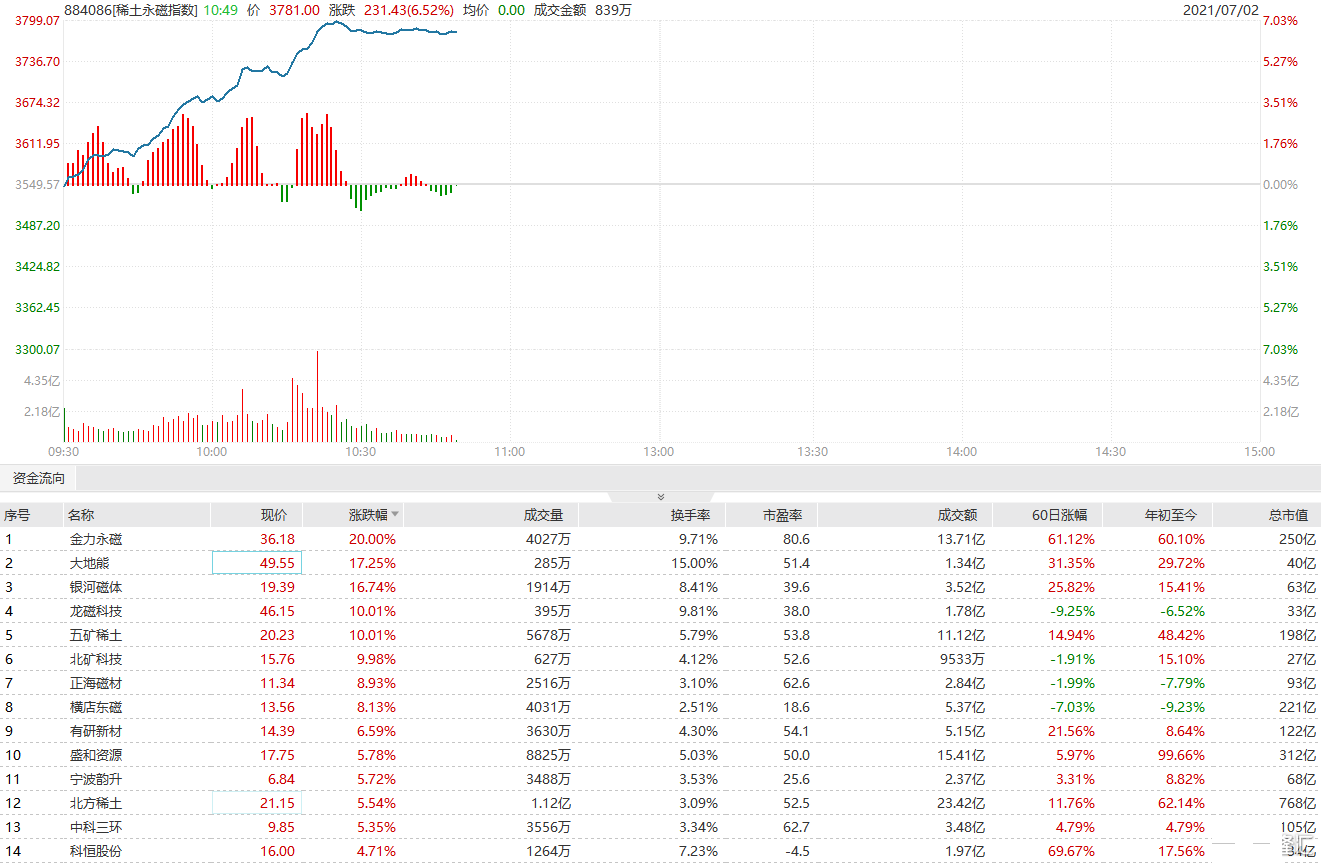 稀土永磁板块持续走强,板块指数盘中一度大涨超7%,金力永磁涨幅达20%封涨停,五矿稀土、北矿科技涨停,大地熊大涨超17%,银河磁体涨超16%,龙磁科技涨超10%,正海磁材、横店东磁、北方稀土等纷纷大涨。