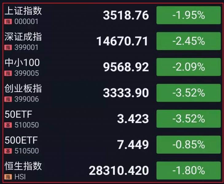 1.上周五三大指数集体低开后开盘跳水,沪指跌逾1.5%失守3600点,深成指跌近2%,创指跌近2.5%失守3400点。午后指数继续跳水,医美、白酒概念走弱,证券、银行等金融板块整体回调,权重股下挫拖累沪指跌2%,深成指跌逾2.5%,创指跌逾3.5%,黄白二线大幅分化,北向资金出逃超80亿元。板块方面,锂电板块逆势上涨,午后掀起涨停潮。总体而言,市场情绪降至冰点,个股跌多涨少,赚钱效应较差。截至收盘,上证指数跌1.95%,报3518.76点,深证成指跌2.45%,报14670.71点,创业板指跌3.52%,报3333.90点;