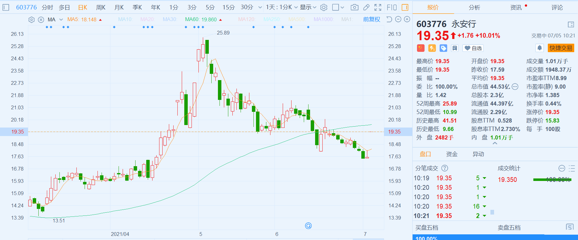 永安行(603776.SH)一字涨停,报19.35元,总市值44.5亿元。