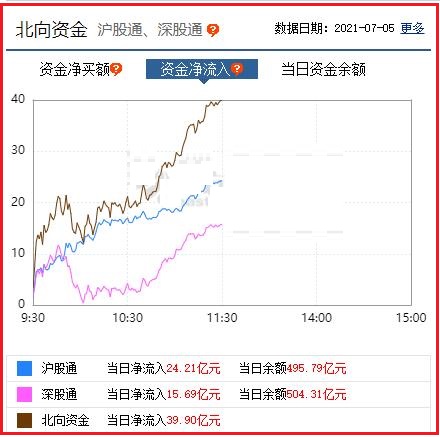 截至午间收盘: 北向资金净流入39.90亿元,其中沪股通资金净流入24.21亿元,深股通资金净流入15.69亿元。