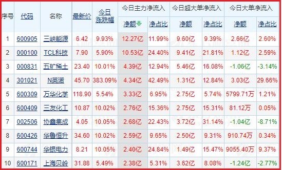 今日沪深两市主力资金净流入排名前5的个股分别为:三峡能源、TCL科技、五矿稀土、N英诺、万华化学;主力资金净流出排名前5的个股分别为:士兰微、复星医药、天齐锂业、爱尔眼科、隆基股份。