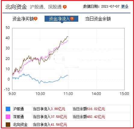 截至午间收盘: 北向资金净流入41.56亿元,其中沪股通资金净流入3.98亿元,深股通资金净流入37.58亿元。