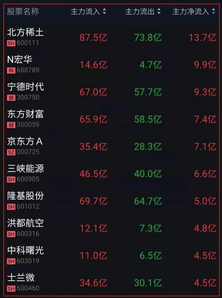 资金净流入十大人气热股: