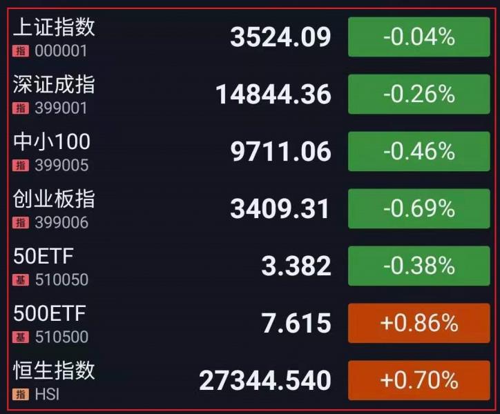 1.上周五A股三大指数全线低开,鸿蒙概念领跌。盘中指数下探回升,沪指一度失守3500点,第三代半导体、集成电路等芯片概念股集体回调,白酒、家电等大消费板块再度重挫;稀土、钛持续大涨,盐湖提锂、锂电池概念延续强势,汽车、环保工程拉升走高。午后,指数震荡回暖,煤炭、有色金属等资源股掀涨停潮,化工、汽车股表现活跃;数字货币、军工股下挫走弱。总体来看,市场情绪有所修复,两市逾2600个股上涨,成交额连续第7个交易日突破1万亿元。截至收盘,上证指数跌0.04%,报3524.09点,深证成指跌0.26%,报14844.36点,创业板指跌0.69%,报3409.31点;