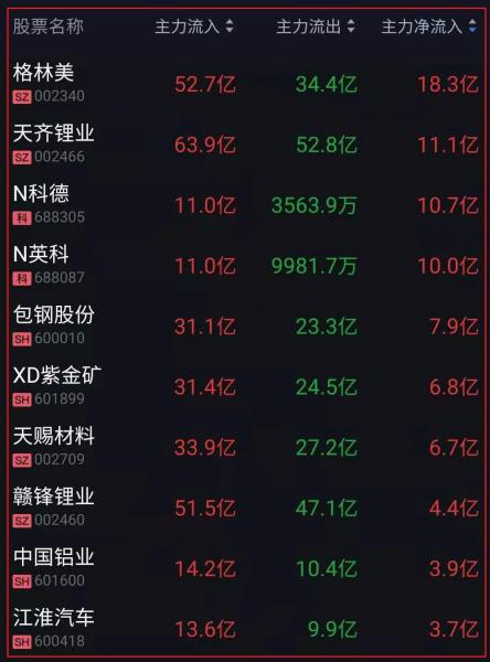 资金净流入十大人气热股: