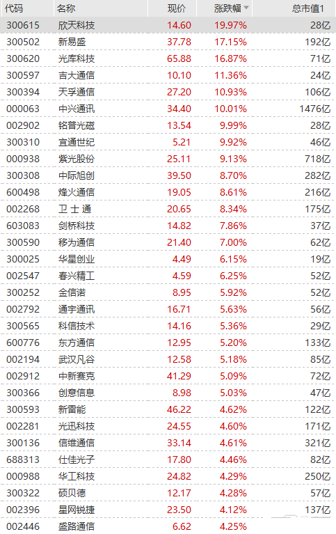 5G板块全线走高,A股中兴通讯封涨停,报34.4元,港股中兴通讯盘中一度大涨超11%;亿通科技涨停,新易盛大涨超17%,光库科技涨近17%,天孚通信、紫光股份、烽火通信、卫士通等集体上涨。5G龙头中兴通讯上周五发布预告,预计上半年实现归属于上市公司普通股股东的净利润38~43亿元,同比增长104.60~131.52%,超预期。
