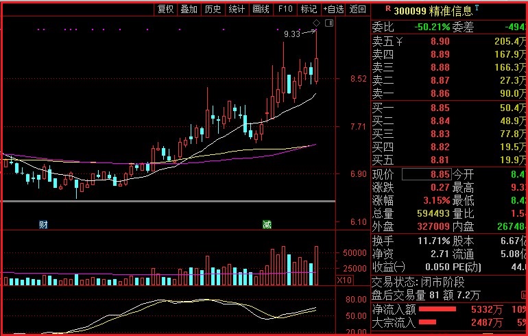 2. 从纯技术面考察,日线KDJ技术指标抬头向上,横向整理方向不明,虽有向上欲望,但仍存持续向下之可能。各短线分时KDJ指标,15、30、60分钟趋势向上,严重超买滞涨迹象明显,向上时空有限,向下调整在即,警惕共振向下中阴杀跌之风险;