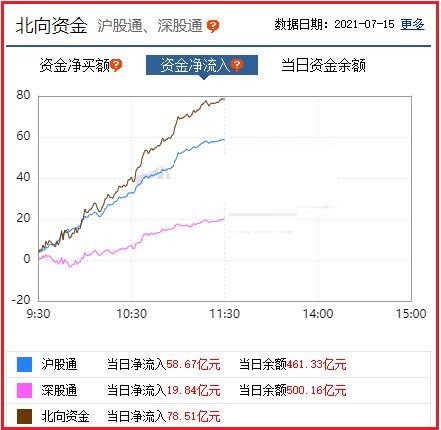 截至午间收盘: 北向资金净流入78.51亿元,其中沪股通资金净流入58.67亿元,深股通资金净流入19.84亿元。