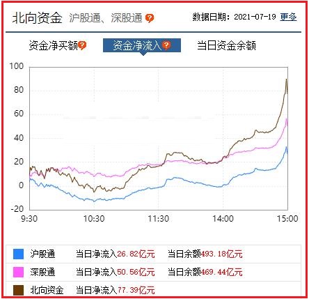截至收盘: 北向资金净流入77.39亿元,其中沪股通资金净流入26.82亿元,深股通资金净流入50.56亿元。