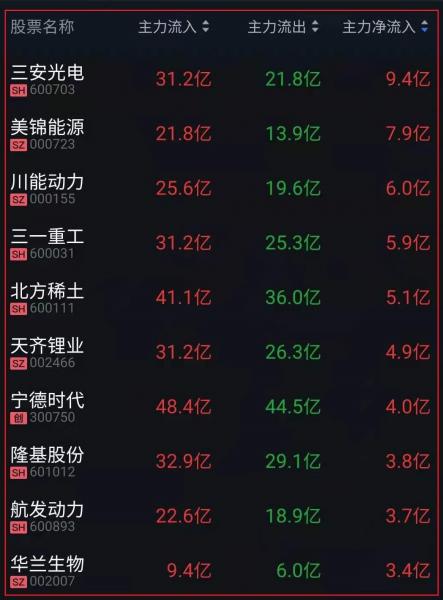资金净流入十大人气热股: