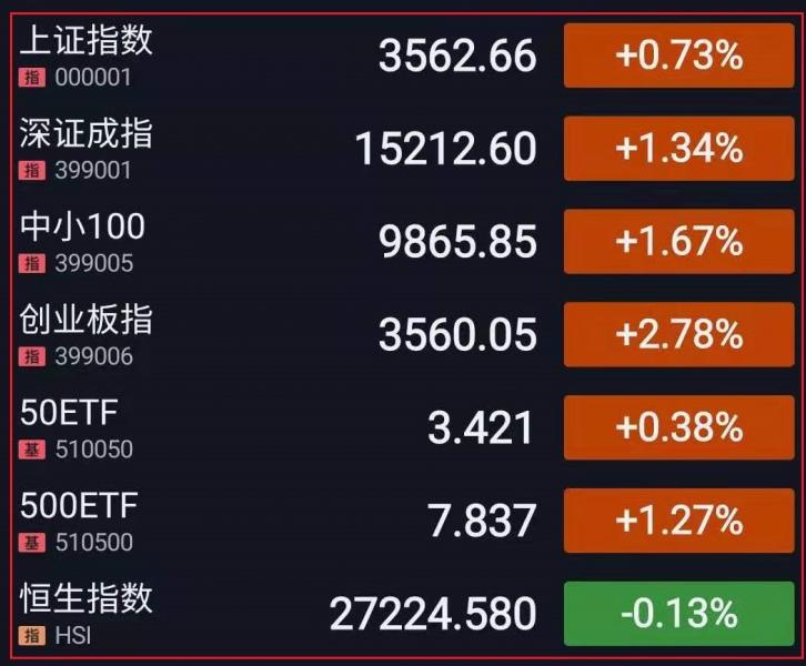 1.A股三大指数集体高开,水利概念领涨。盘中指数冲高震荡,盐湖提锂、锂电池概念掀涨停潮,半导体、鸿蒙概念、MCU芯片、集成电路等科技股持续爆发,稀土、汽车走强;煤炭、机场航运回调,餐饮、旅游板块下挫走弱。午后,创指继续上扬,一度涨逾3%创近6年新高,光伏、军工、钛异动拉升;猪肉、白酒概念下挫走弱。总体来看,市场情绪大幅回暖,两市逾2800个股上涨,成交额再破万亿。截至收盘,上证指数涨0.73%,报3562.66点,深证成指涨1.34%,报15212.60点,创业板指涨2.78%,报3560.05点;