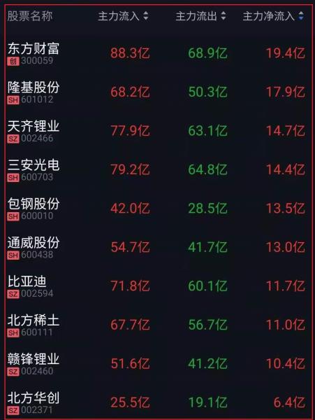 资金净流入十大人气热股: