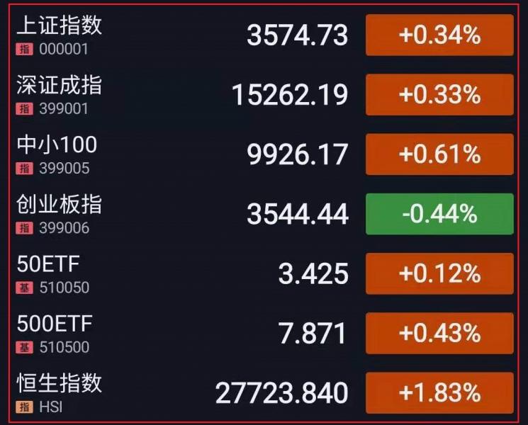 1.A股三大指数集体高开,盐湖提锂领涨。盘中,沪指横盘整理,创指震荡下行,BIPV、有机硅等光伏概念再掀涨停潮,光刻胶、半导体等科技股活跃,稀土、油服、钢铁、煤炭等逆势走强;白酒、餐饮等大幅走弱,中药、医美、医疗器械等全线重挫。午后指数延续分化,资源股持续爆发,大消费板块走弱。总体来看,市场仍旧维持震荡修复,受外围市场影响大宗商品再度强势,前期大涨的消费板块估值回调。成交方面,沪深两市成交额超过12000亿元。截至收盘,上证指数涨0.34%,报3574.73点,深证成指涨0.33%,报15262.19点,创业板指跌0.44%,报3544.44点;