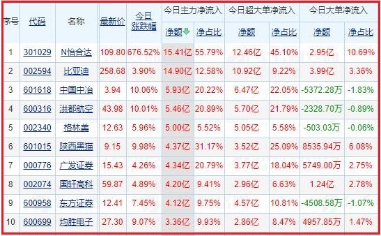今日沪深两市主力资金净流入排名前5的个股分别为:N怡合达、比亚迪、中国中冶、洪都航空、格林美;主力资金净流出排名前5的个股分别为:京东方A、中远海控、东方财富、包钢股份、牧原股份。
