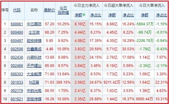 今日沪深两市主力资金净流入排名前5的个股分别为:中芯国际、士兰微、驰宏锌锗、协鑫集成、兴森科技;主力资金净流出排名前5的个股分别为:五 粮 液、东方财富、贵州茅台、隆基股份、爱尔眼科。
