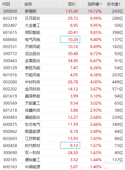 风电板块强势攀升,日月股份、大金重工封涨停,新强联、明阳智能冲击涨停,电气风电涨超9%,天顺风能涨超8%,运达股份、金雷股份、节能风电等大幅跟涨。