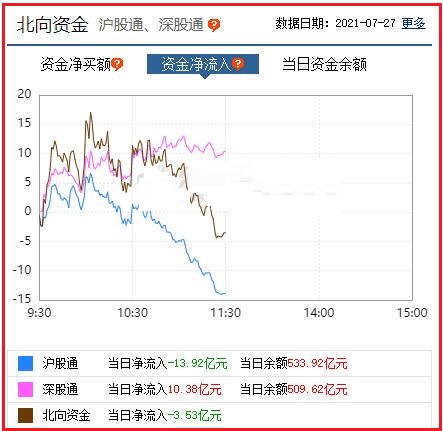 截至午间收盘: 北向资金净流出3.53亿元,其中沪股通资金净流出13.92亿元,深股通资金净流入10.38亿元。