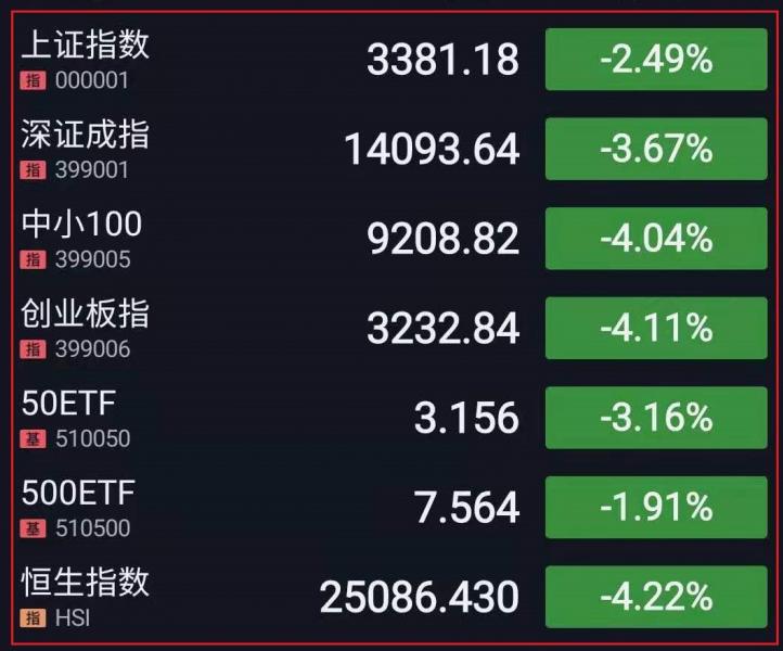 1.三大指数小幅高开,开盘后冲高回落,临近尾盘指数回暖,科创50指数盘中大涨超3%。板块方面,白酒概念板块继续回调,煤炭、有色等资源股涨幅居前,半导体板块持续拉升,中芯国际(64.400 7.20 12.59%)一度涨停。午后指数跳水,沪指跌近2%,跌穿年线后继续下挫跌破3400点,深成指跌逾3%,创指跌超4%,日内振幅超过5%,科创50指数翻绿,盘内一度涨逾4%,上证50指数(3126.3757 -101.99 -3.16%)跌逾3%再创调整新低。北向资金流出近50亿元,沪深两市成交额突破1.5万亿元。板块方面,白酒概念持续低迷,半导体板块延续强势,国防军工板块再度拉升。总体而言,资金避险情绪明显,多空双方博弈激烈,板块、个股普跌,赚钱效应较差。截至收盘,上证指数跌2.49%,报3381.18点,深证成指跌3.67%,报14093.64点,创业板指跌4.11%,报3232.84点;