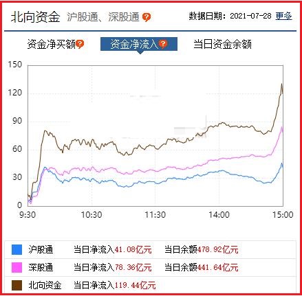 截至收盘: 北向资金净流入119.44亿元,其中沪股通资金净流入41.08亿元,深股通资金净流入78.36亿元。