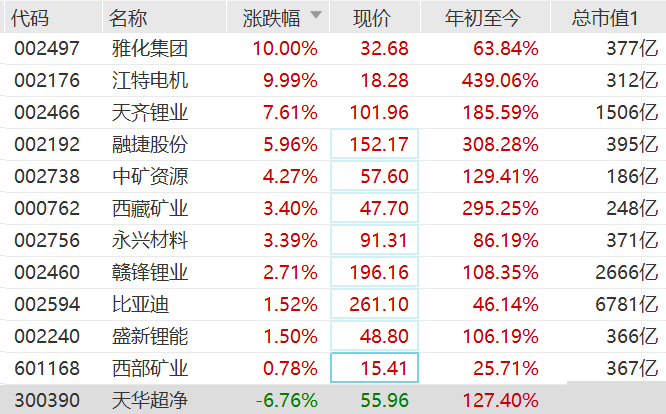 锂矿指数一度涨超5%,成分股中,雅化集团、江特电机涨停,天齐锂业触及涨停板,突破百元大关至104.23元;融捷股份、中矿资源、西藏矿业、赣锋锂业等跟涨。