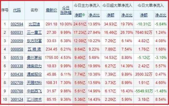 今日沪深两市主力资金净流入排名前5的个股分别为:比亚迪、三一重工、东方财富、五 粮 液、贵州茅台;主力资金净流出排名前5的个股分别为:北方稀土、赣锋锂业、阳光电源、天齐锂业、包钢股份。