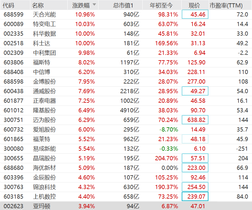 A股光伏股拉升,板块指数一度涨超4%。 天合光能涨超10%,特变电工、科华数据、科士达和中利集团涨停,福斯特逼近涨停,中信博、金博股份、通威股份和正泰电器涨超7%,隆基股份、迈为股份和爱旭股份涨超6%。