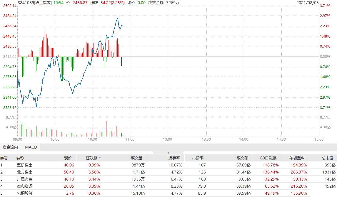 稀土板块大幅拉升,五矿稀土涨停,北方稀土、盛和资源、广晟有色均涨超3%。7月份以来,稀土价格持续上涨。业内人士指出,新能源汽车等新兴下游需求开始爆发,政策端对上游供给或将持续严控,稀土行业历史性拐点已经到来,稀土板块或迎来业绩与估值的戴维斯双击。近期市场做多资金也涌入部分稀土概念股,北方稀土、五矿稀土、盛和资源最受资金青睐。