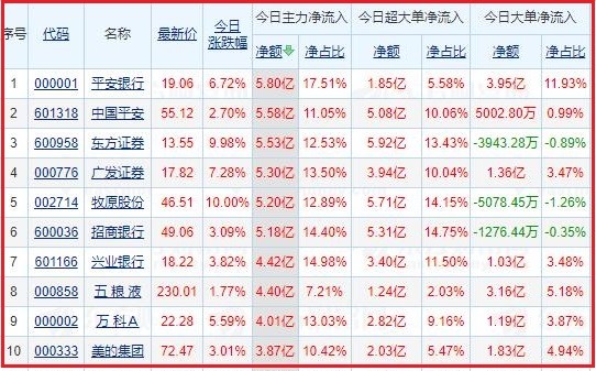 今日沪深两市主力资金净流入排名前5的个股分别为:平安银行、中国平安、东方证券、广发证券、牧原股份;主力资金净流出排名前5的个股分别为:隆基股份、比亚迪、宁德时代、北方稀土、中芯国际。