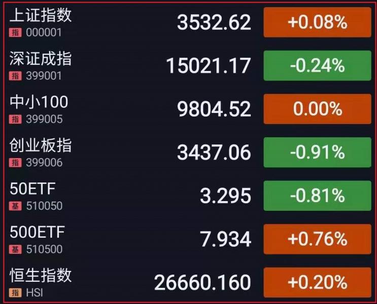 1.三大指数小幅低开后走势分化,沪指在银行、地产板块等权重板块推动下表现相对强势,创指黄白线走势背离幅度较大,黄线在上白线在下。板块方面,银行、地产等前期超跌权重股回暖,军工维持较高景气,储能板块掀起涨停潮。午后三大指数窄幅波动,北向资金持续流出,两市成交额再破万亿。板块方面,稀土永磁板块活跃,证券板块走弱。总体而言,市场风格转变,资金高低切换,个股涨跌参半,赚钱效应一般。截至收盘,沪指涨0.08%,报3532.62点,成交额达5419亿元;深成指跌0.24%,报15021.17点,成交额达7407亿元;创指跌0.91%,报3437.06点,成交额达3050亿元。