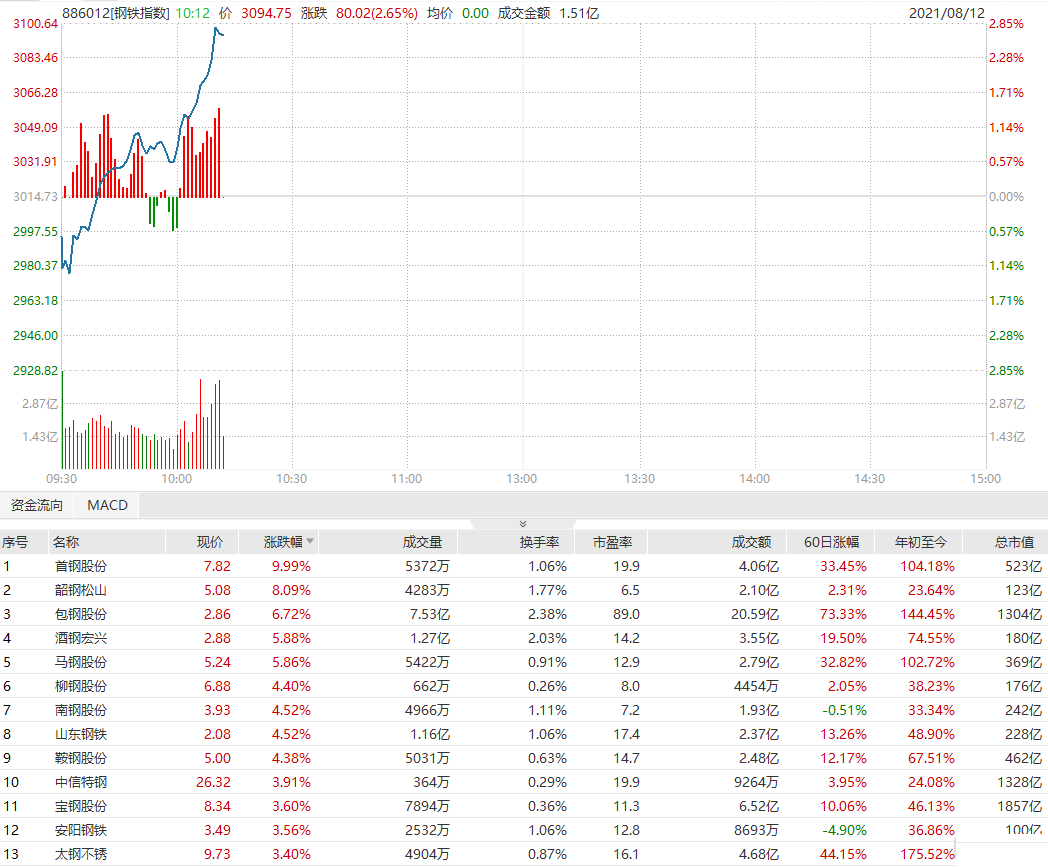 钢铁板块持续上扬,首钢股份涨停,韶钢松山大涨超8%,包钢股份涨超6%,酒钢宏兴、马钢股份涨近6%,柳钢股份、囊股份等纷纷跟涨。
