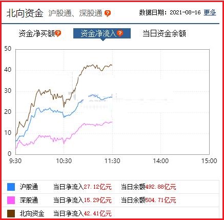 截至午间收盘: 北向资金净流入42.41亿元,其中沪股通资金净流入27.12亿元,深股通资金净流入15.29亿元。