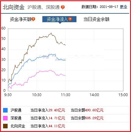 截至午间收盘: 北向资金净流入44.11亿元,其中沪股通资金净流入29.40亿元,深股通资金净流入14.71亿元。