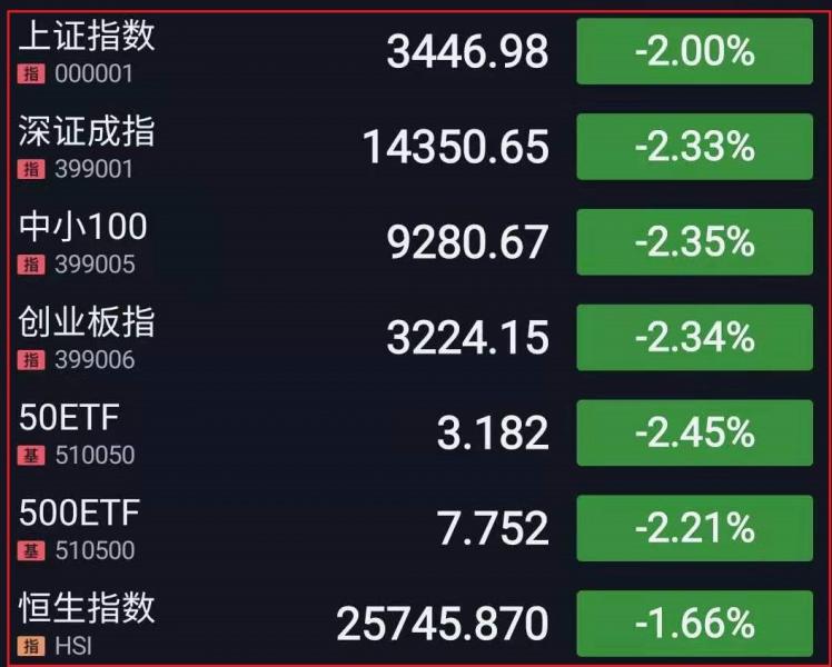 1.A股三大指数开盘涨跌不一。盘中指数弱势震荡,医药、白酒概念下挫走弱,半导体、鸿蒙概念、集成电路等科技股回调,化工、农业股表现低迷;石油、天然气等能源板块逆势走高,证券、银行等金融股强势护盘,航运概念、有色冶炼、水利概念等活跃。午后指数大幅跳水,三大股指均跌超2%,芯片概念股持续重挫,消费板块大幅回调;军工股短线拉升。总体来看,市场担忧情绪蔓延,资金面有所收紧,两市逾3800个股下跌,贵州茅台(1635.000 -64.20 -3.78%)大跌逾4%。截至收盘,上证指数跌2.00%,报3446.98点,深证成指跌2.33%,报14350.65点,创业板指跌2.34%,报3224.15点;