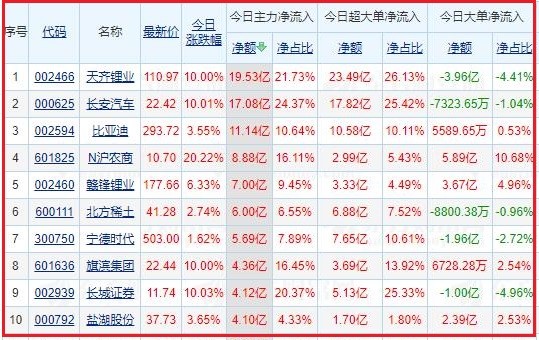 今日沪深两市主力资金净流入排名前5的个股分别为:天齐锂业、长安汽车、比亚迪、N沪农商、赣锋锂业;主力资金净流出排名前5的个股分别为:中国平安、紫金矿业、东方财富、五 粮 液、三一重工。