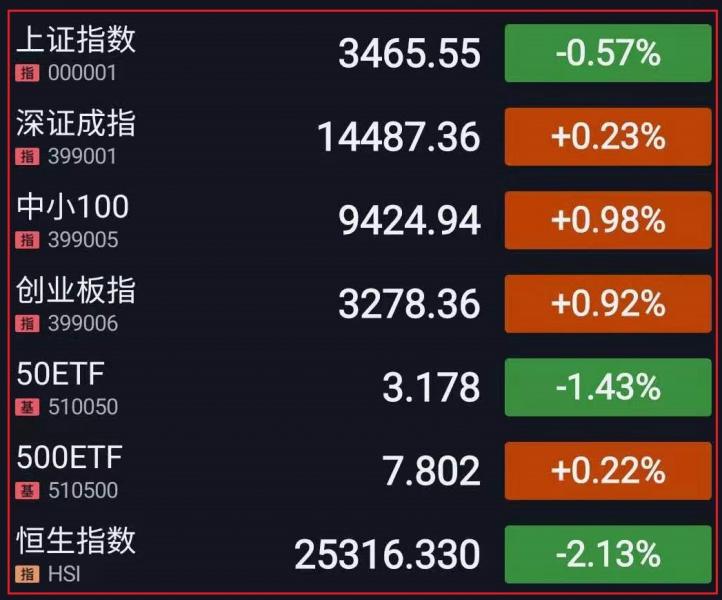1.A股三大指数开盘涨跌不一。随后盘中指数走势分化,军工股再度走强,在线教育、CRO概念等板块持续拉升,盐湖提锂、鸿蒙概念股活跃;氢能源、啤酒板块下挫走弱,煤炭、煤炭、石油、钢铁、化工等周期板块集体走低。午后指数震荡回暖,创指一度站上3300点,锂电概念再掀涨停潮,汽车、芯片股先后拉升;证券、银行等金融板块持续回调。总体来看,大盘仍在震荡修复,权重股多数回调,两市逾2600个股下跌。截至收盘,上证指数跌0.57%,报3465.55点,深证成指涨0.23%,报14487.36点,创业板指涨0.92%,报3278.36点;