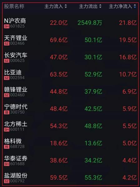 资金净流入十大人气热股: