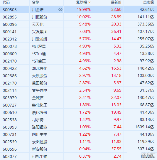 磷化工板块走高,川金诺、川恒股份相继封板,云天化大涨超9%,兴发集团、川发龙蟒等跟涨。