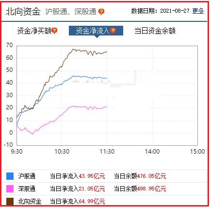 截至午间收盘: 北向资金净流入64.99亿元,其中沪股通资金净流入43.95亿元,深股通资金净流入21.05亿元。