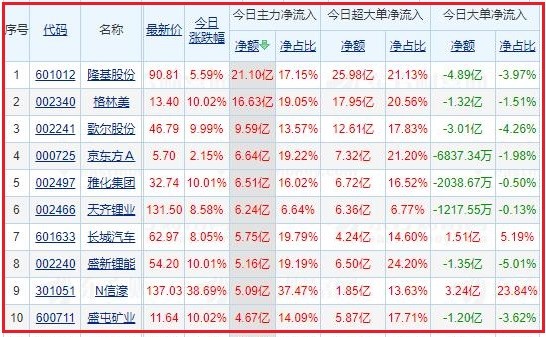 今日沪深两市主力资金净流入排名前5的个股分别为:隆基股份、格林美、歌尔股份、京东方A、雅化集团;主力资金净流出排名前5的个股分别为:宁德时代、美锦能源、海康威视、紫光国微、长春高新。