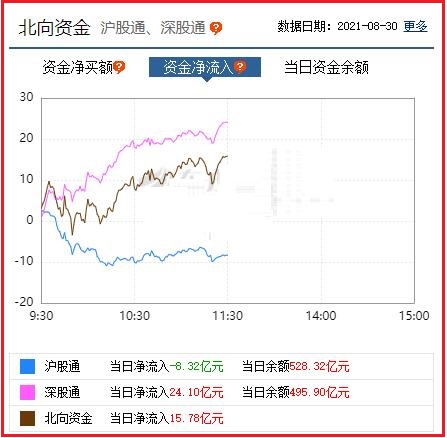 截至午间收盘: 北向资金净流入15.78亿元,其中沪股通资金净流出8.32亿元,深股通资金净流入24.10亿元。