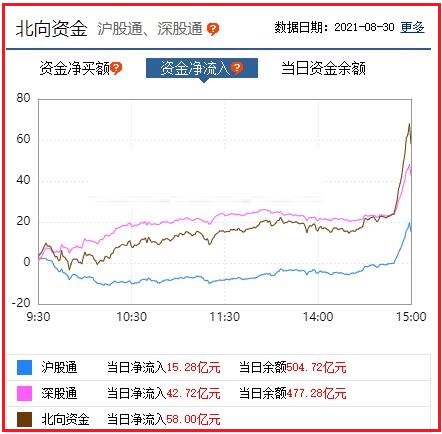 截至收盘: 北向资金净流入58.00亿元,其中沪股通资金净流入15.28亿元,深股通资金净流入42.72亿元。